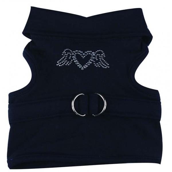 Een simpel maar comfortabel harnas. Voorzien van stijlvolle kraag en glimmend hartje met vleugels. De dubbele D ringen staan voor extra veiligheid en comfort.